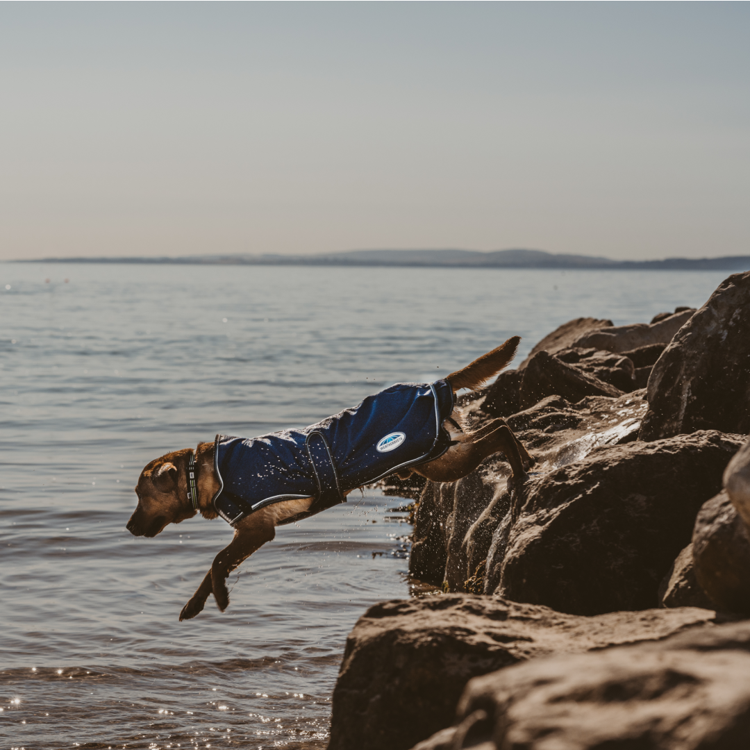 Stretch gusset and arched legs for freedom of movement with a full belly wrap and adjustable touch tape closures for extra warmth and protection in cooler conditions. Contoured back seem shapes around the tail. Features large collar, elasticated leg straps and leash hole.