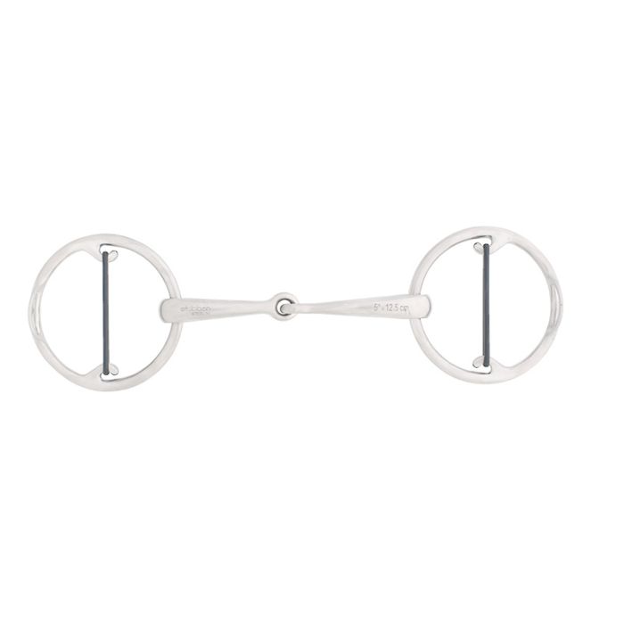 The "bucephalus pro horse bit" is a soft action loose ring snaffle bit. The reins are attached to the bit with two strong rubber bands within the O-rings. This creates a flexible connection between the riders hand to the horses mouth thus encouraging the connection from the hind leg into the rein. The pressure transmitted through the horses mouth is reduced thereby promoting forward motion, rhythm and a softer contact. This naturally encourages elasticity in the horses movement and willingness in the collection.