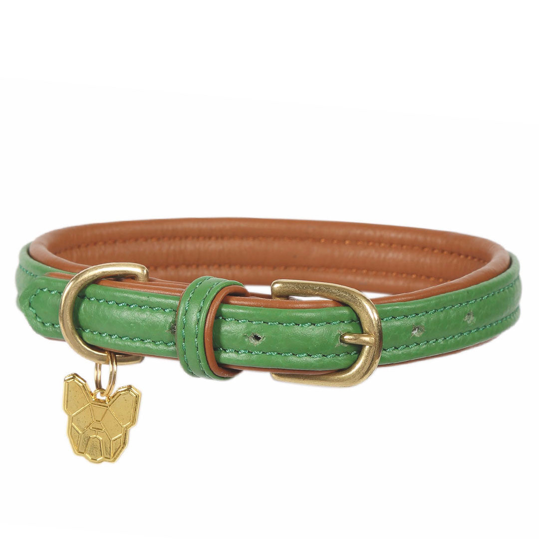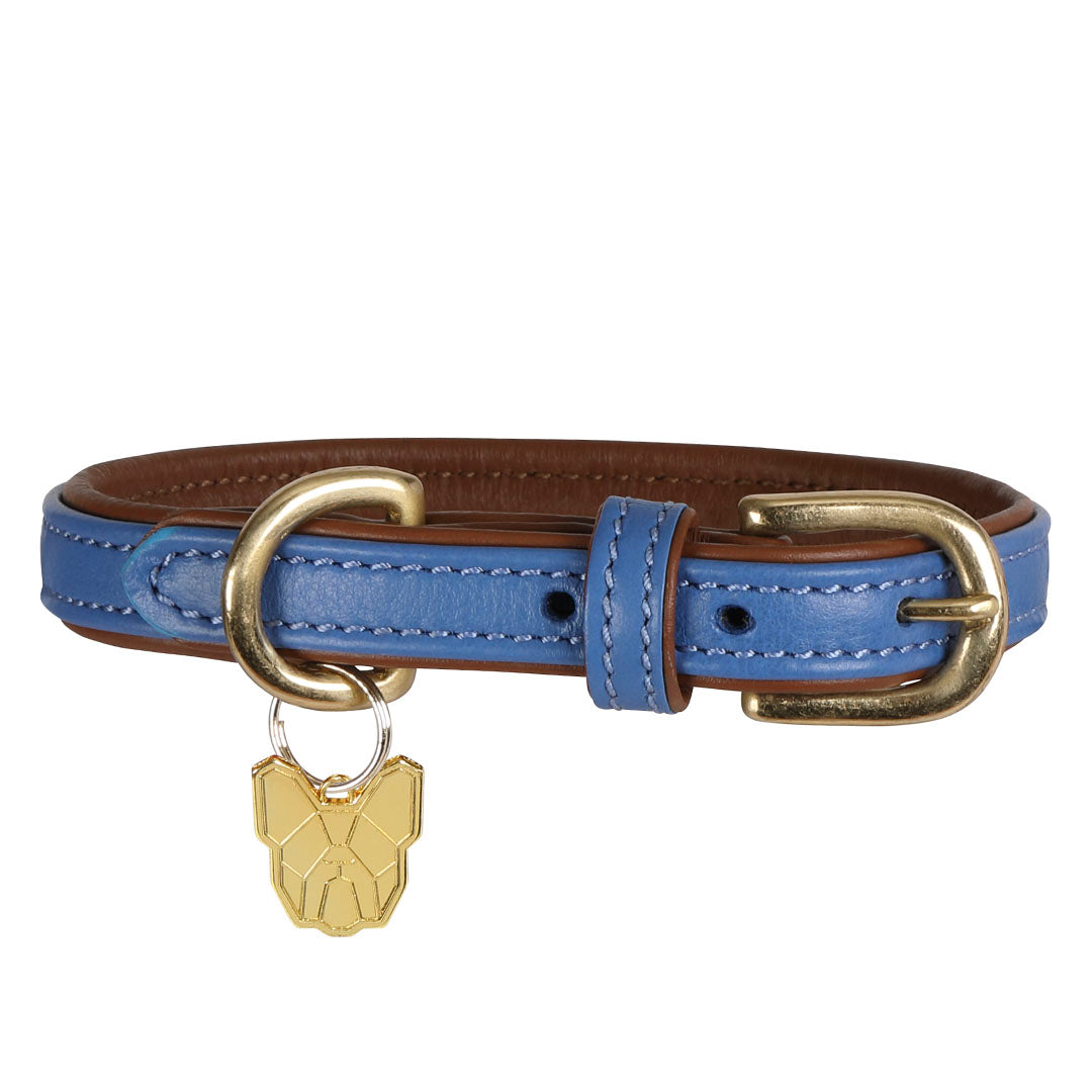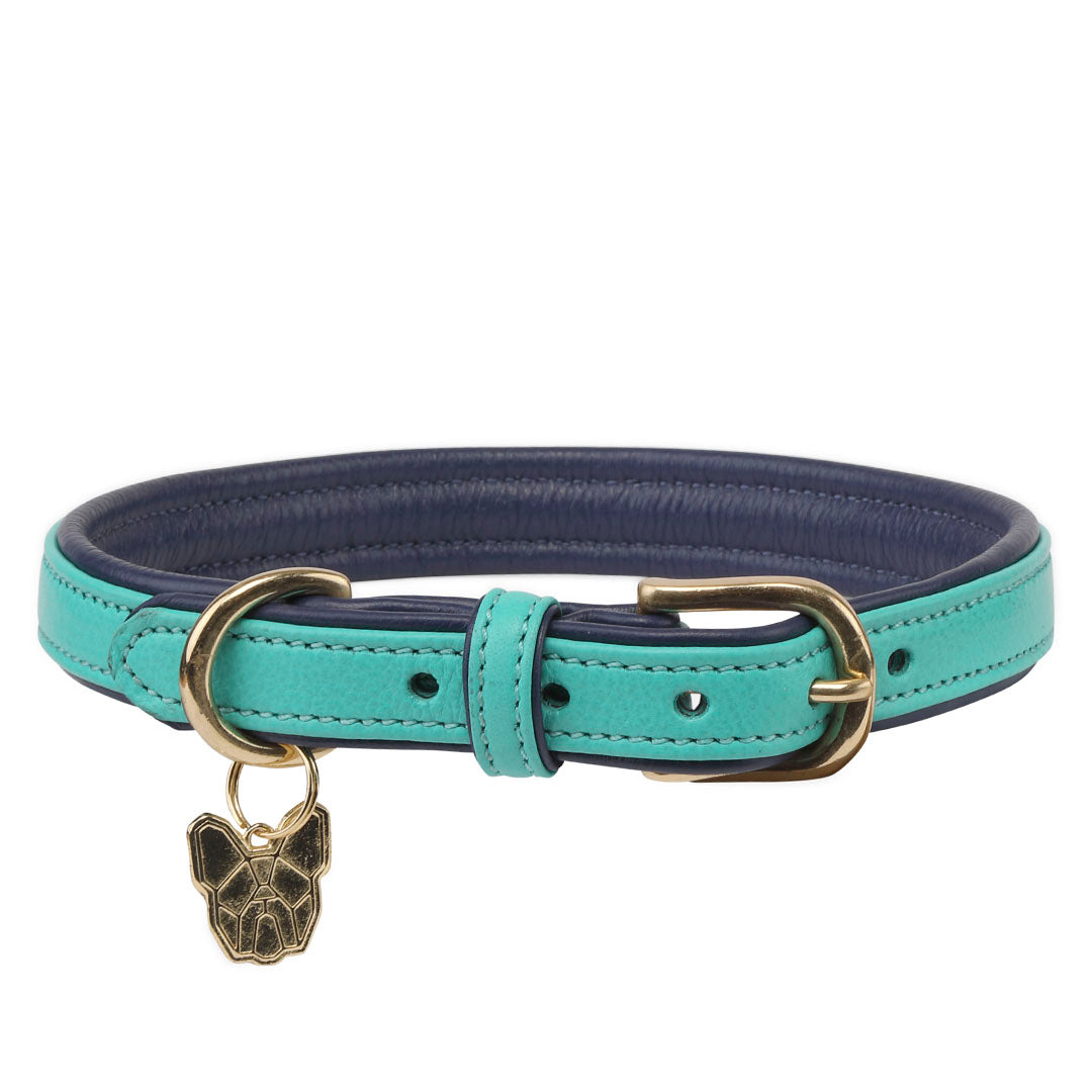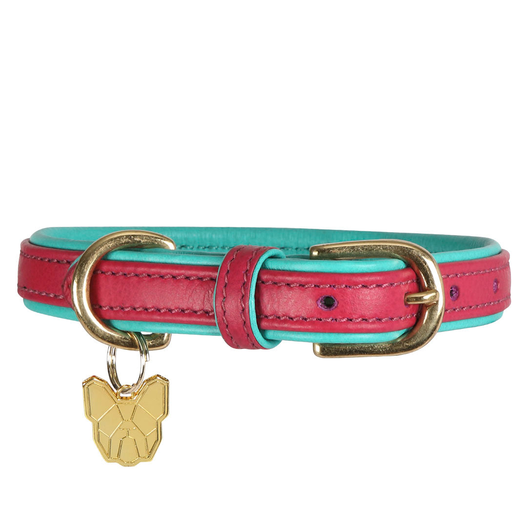A colourful range made from folded leather and lined with soft padded leather for greater comfort. The padded leather dog collar is finished with a brass colour buckle and D-ring and the Digby & Fox tag.