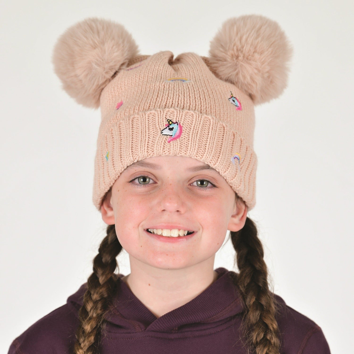The Dublin Kids Embroidered Fun Benaie is the perfect winter warmer to help to keep your child warm this winter. This knitted childs hat has colourful embroidered designs to brighten up the winter days! With double tone tone faux fur pom poms and a ribbed folded cuff for an customised fit.