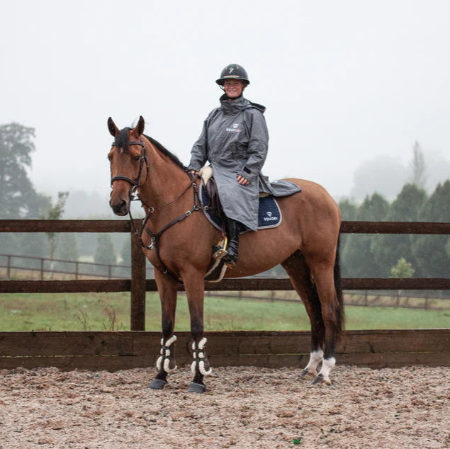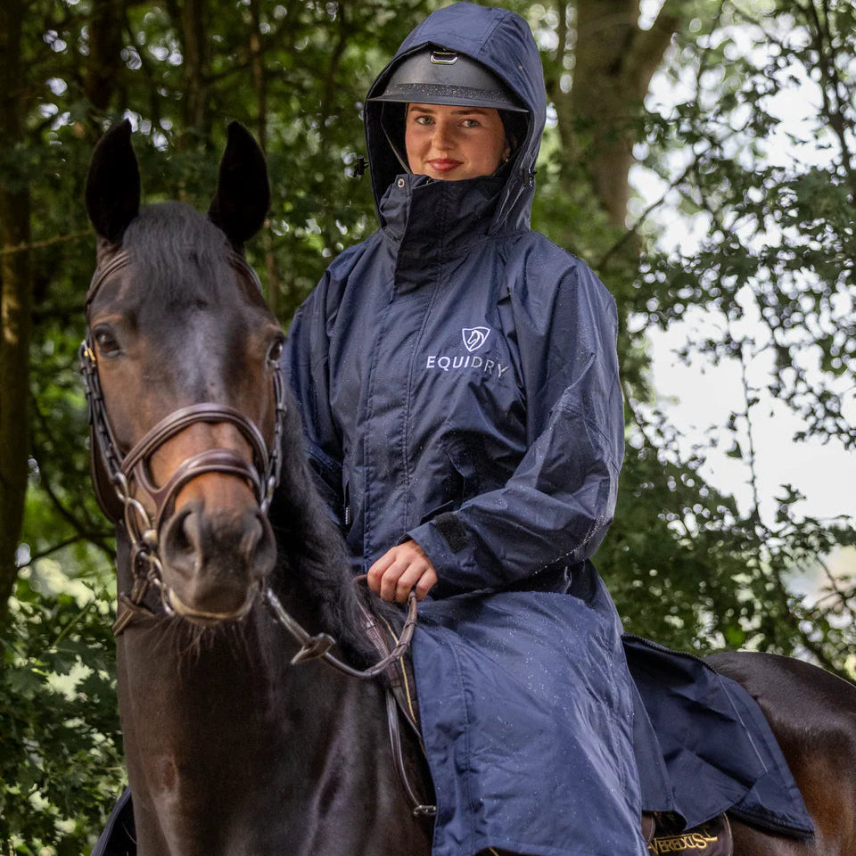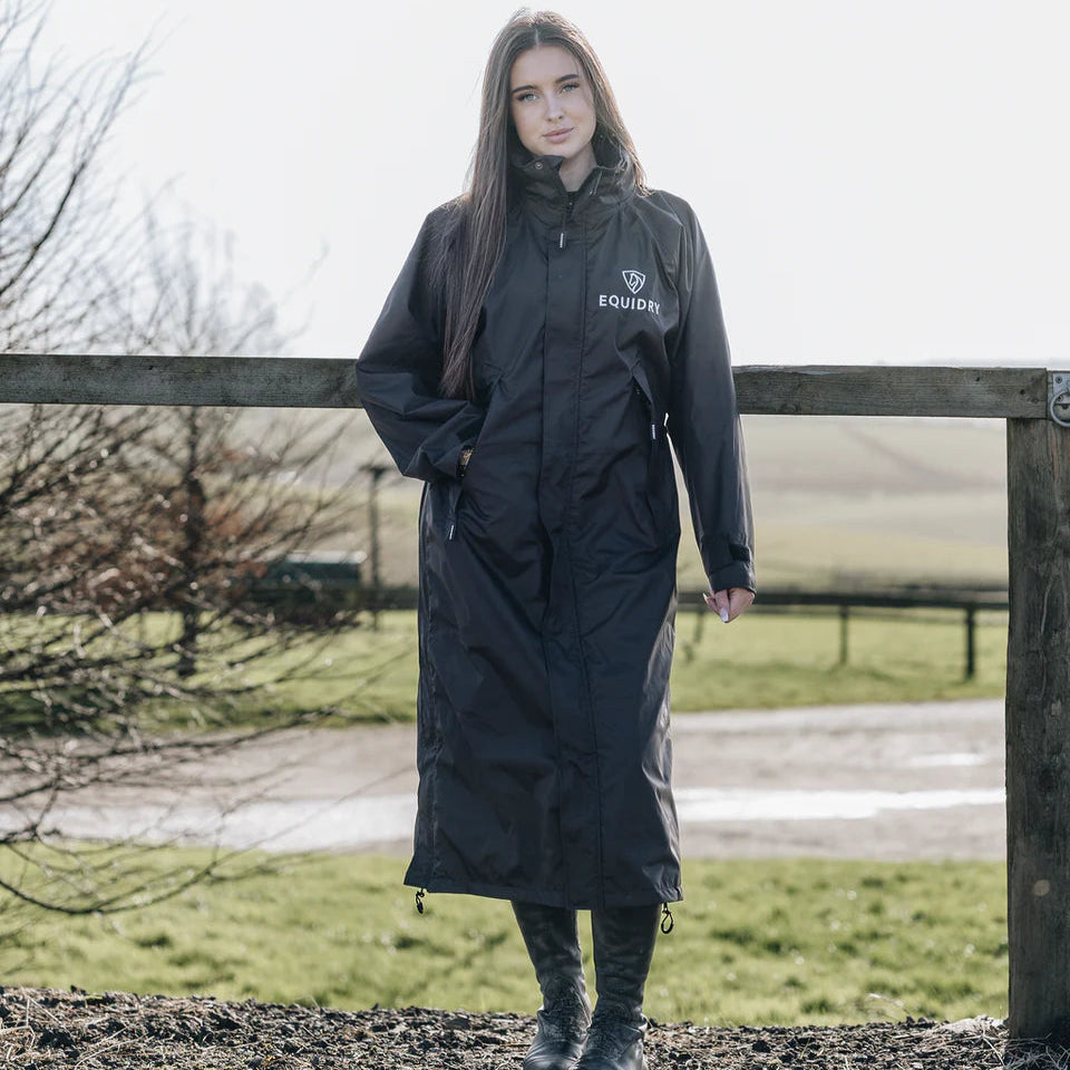 Stay dry, warm, and ready for anything in the EQUIDRY Evolution. Designed to be oversized and worn full length, this performance coat boasts a remarkable 20,000mm waterproof rating, is fully breathable, mesh-lined, and layer-friendly — even fitting over a body protector. Features include riding side zips that hold the coat securely in place and reveal hidden storm skirts that flare out in the saddle for enhanced leg coverage, along with adjustable cuffs, multiple pockets, and internal embroidery access.