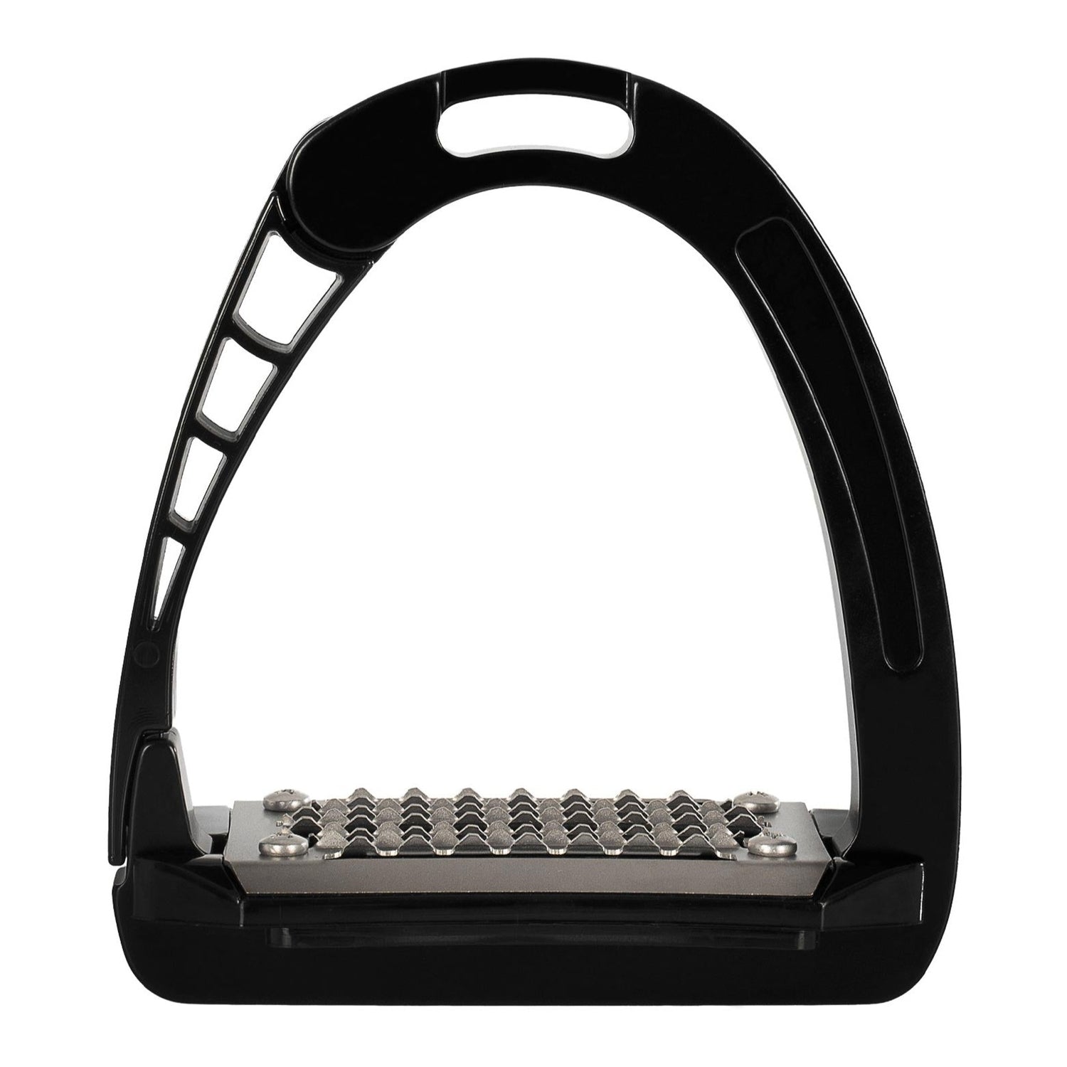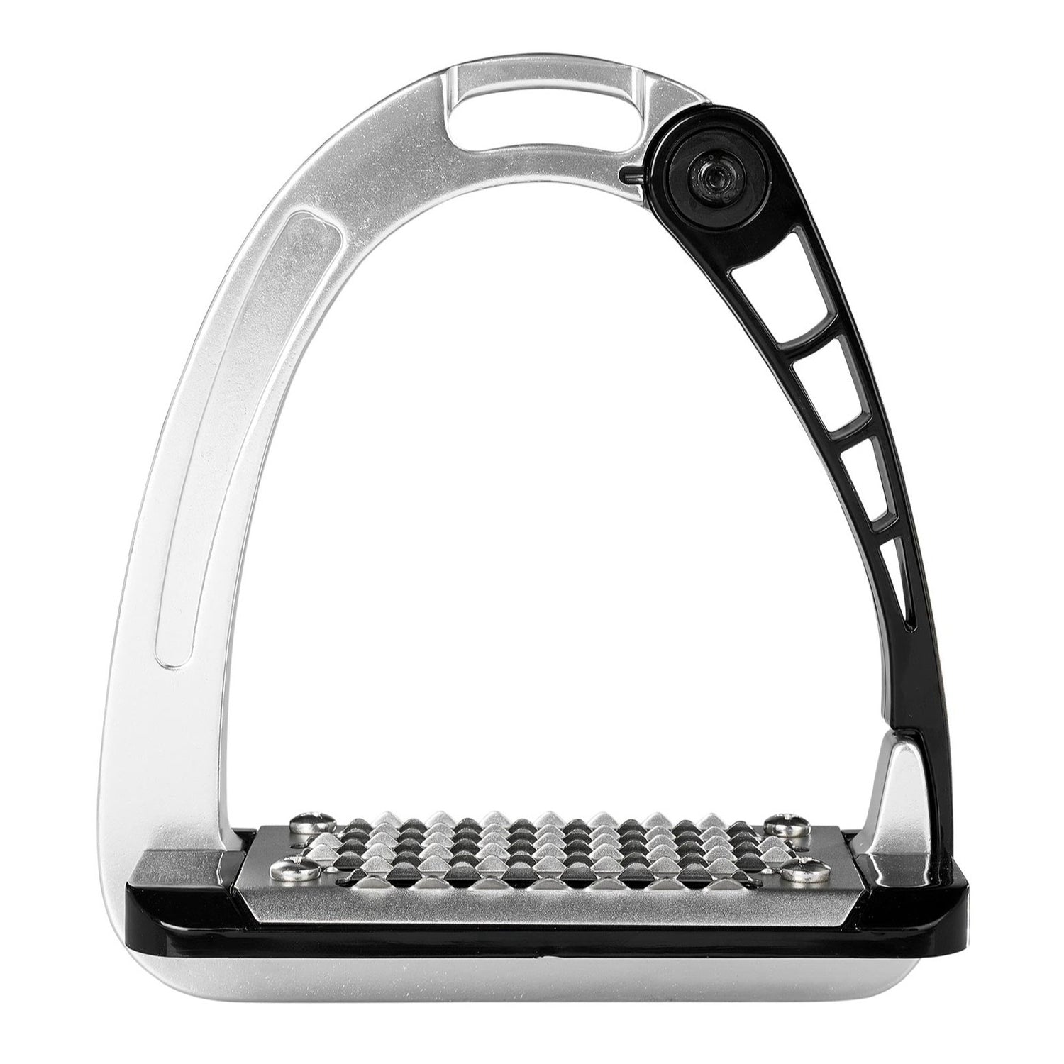 The patented and laterally opening arm, produced by means of an innovative, injection moulding technique. The outer articulated stirrup arm helps the foot release in case of emergency.