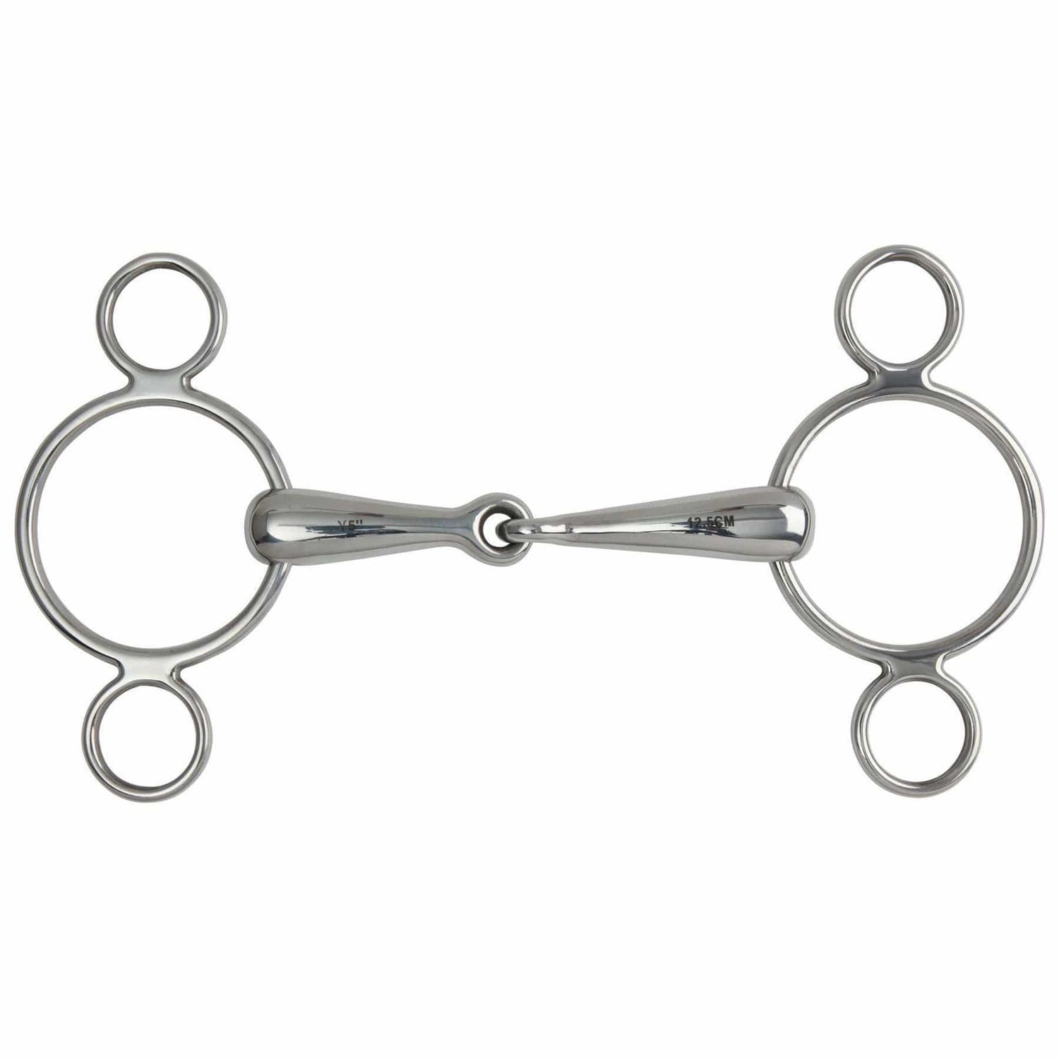 Ein hohler Mund macht dieses Gebiss leichter und weicher, während der Knebel mit zwei Ringen Hebelmöglichkeiten bietet, um die Härte zu erhöhen. Die 5-Zoll- und kleineren Größen dieses Gebisses verfügen über kürzere Backen, um sicherzustellen, dass das Gebiss im Verhältnis zum kleineren Kopf bleibt.