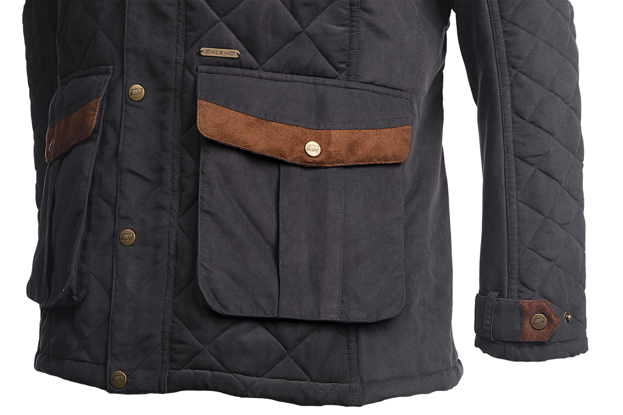 - 1 vertikal eingesetzte Brusttasche mit Reißverschluss, 2 aufgesetzte Taschen mit Zwickel unter Patte mit Druckknopf, 2 Seitentaschen mit Druckknöpfen