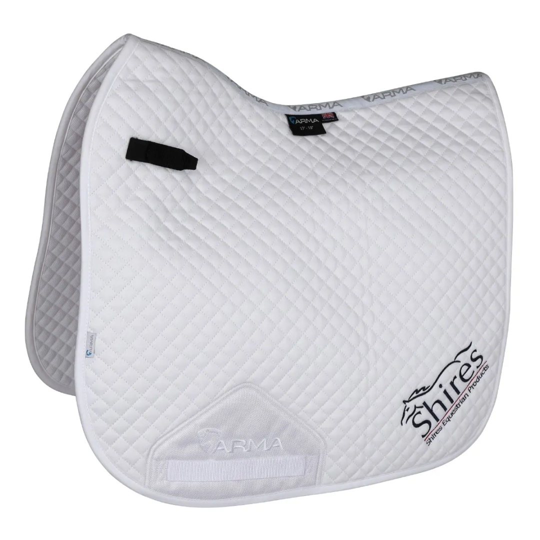 Die Shires-Marken-Dressurschabracke trägt ein elegantes Branding und wird vom #shiresprorider-Team verwendet. Atmungsaktives, atmungsaktives, pillinghemmendes Obermaterial aus 100 % Baumwolle. Das ULTRA DRI ZONE-Futter leitet den Schweiß sofort vom Pferd ab, um das Risiko von Reibung zu verringern und den Komfort zu erhöhen. Gurtführungen und elastische D-Ring-Riemen für bequeme Sicherheit. Strapazierfähige Gurtschoner.