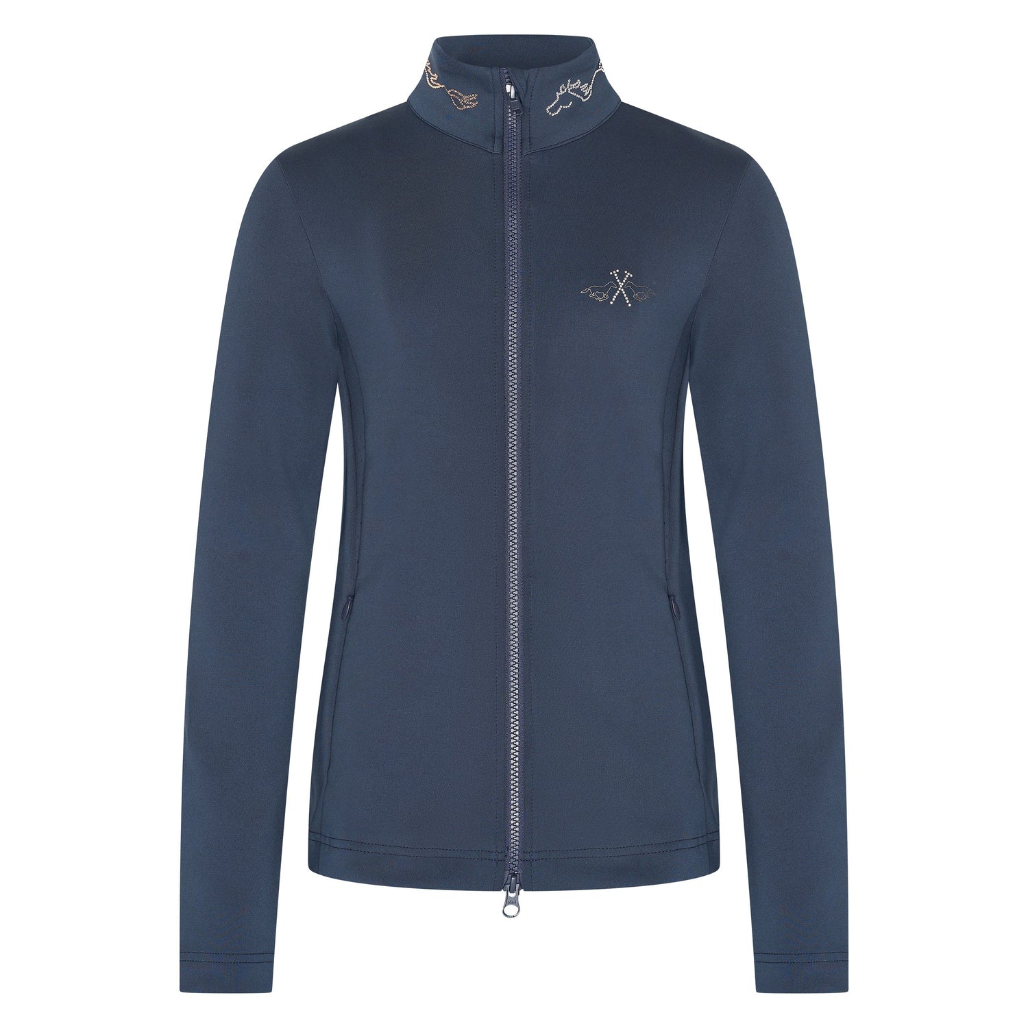 The HV Polo Lilian Children's Tech Cardigan combines functionality with style, crafted from tech jersey fabric and featuring a two-way front zipper. Designed with a chin protector and adorned with rhinestone accents, it offers a refined look. Perforated panels enhance ventilation, while practical pockets and printed horse motifs make it an ideal choice for young riders.