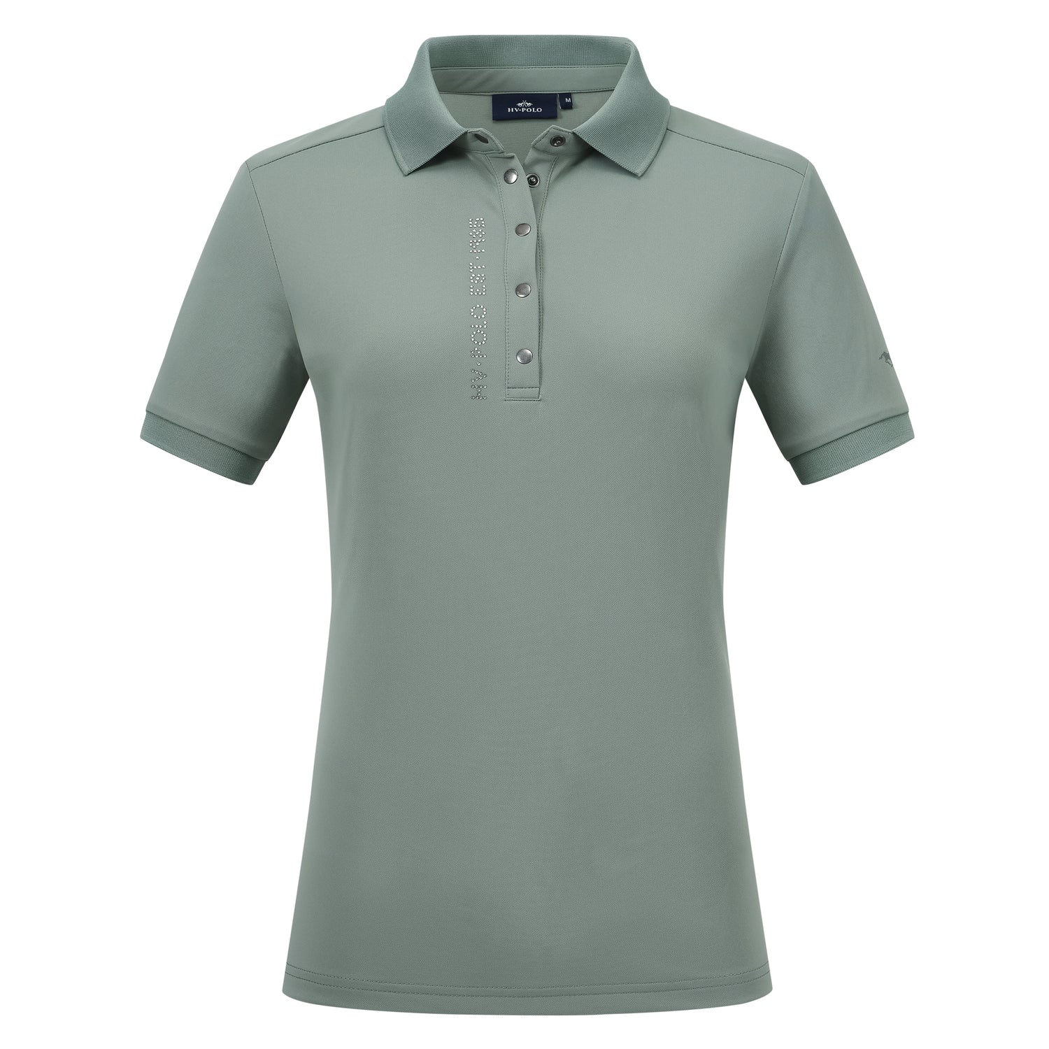 The HV Polo Myrthe Tech Polo is a polo shirt has 4-way stretch technology for ultimate comfort. It also features a quick dry design and a flat knit collar. A stylish touch is added with text in Rhinestones on the wearer's right chest, next to the CF Placket, and a dotted metallic print of horses on the left sleeve. The back neck contains small print detailing the functions of the polo, and it is finished with metal snaps for closure at the centre front.