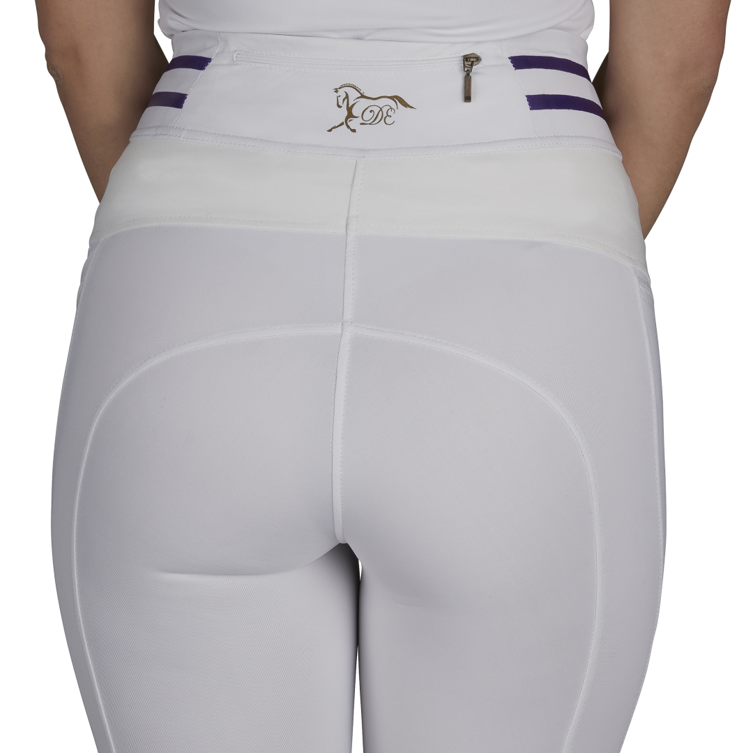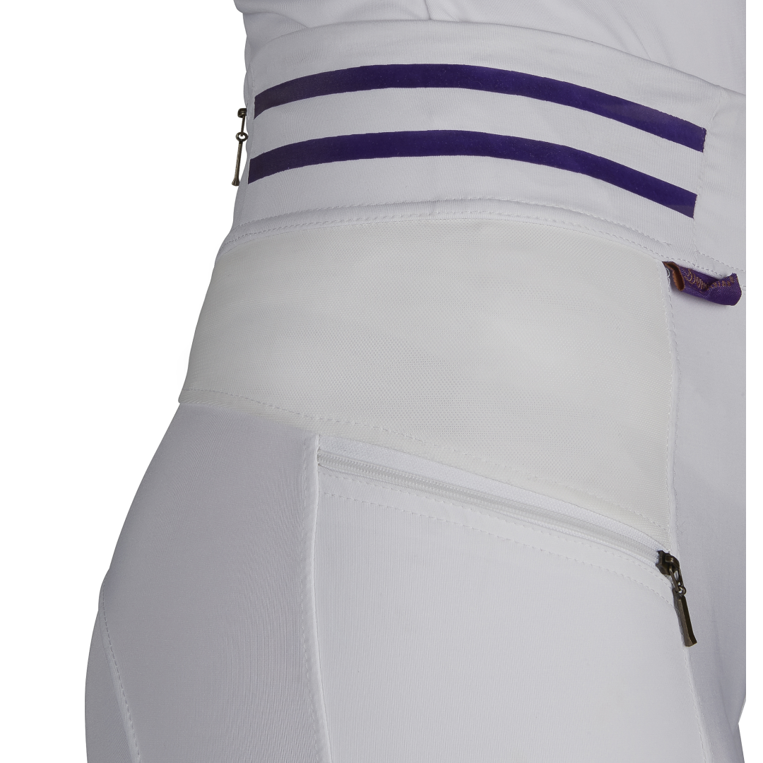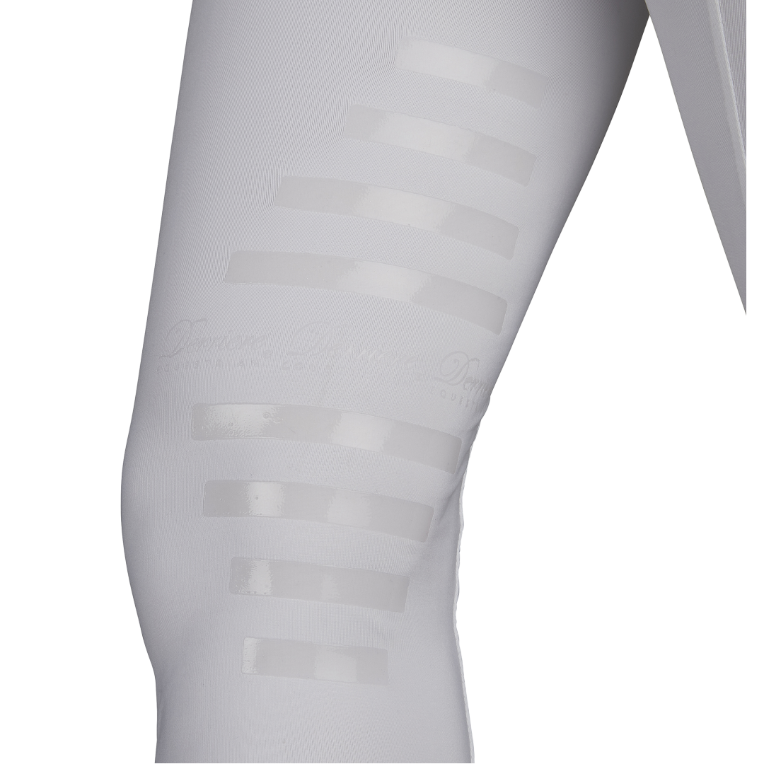 Innovatives, flexibles Sportmaterial in Kombination mit langlebigen Kniestreifen aus Silikon bietet dem Reiter einen bequemen und dennoch dezenten Halt und unterstützt die Leistung, indem es die Innenseite des Knies und die obere Wade stützt und es dem Körper ermöglicht, sich mit der Bewegung des Pferdes zu bewegen. Die verwendete transparente Silikon-Grifftechnologie ist getestet und zertifiziert und schränkt die Bewegungsfreiheit in keiner Weise ein.