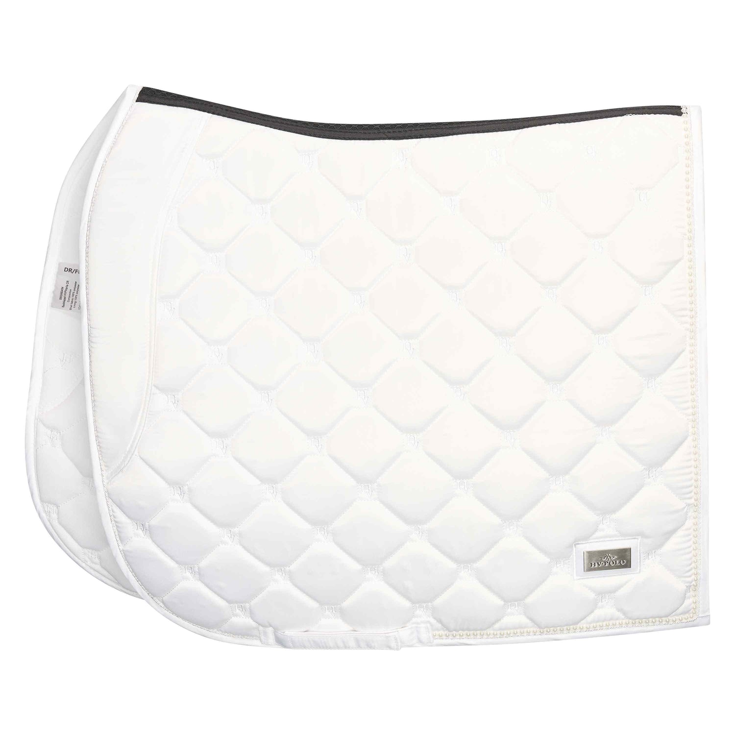The HV Polo Marlie Dressage Saddle Pad offers expert cushioning at the front to prevent saddle slipping and extra space at the withers for ultimate comfort. With breathable mesh lining and backline, plus dirt repellent top material, this pad keeps your horse cool and clean. The all over logo quilting, fancy twisted rope and pearl chain, and metal logo plate add a touch of elegance.