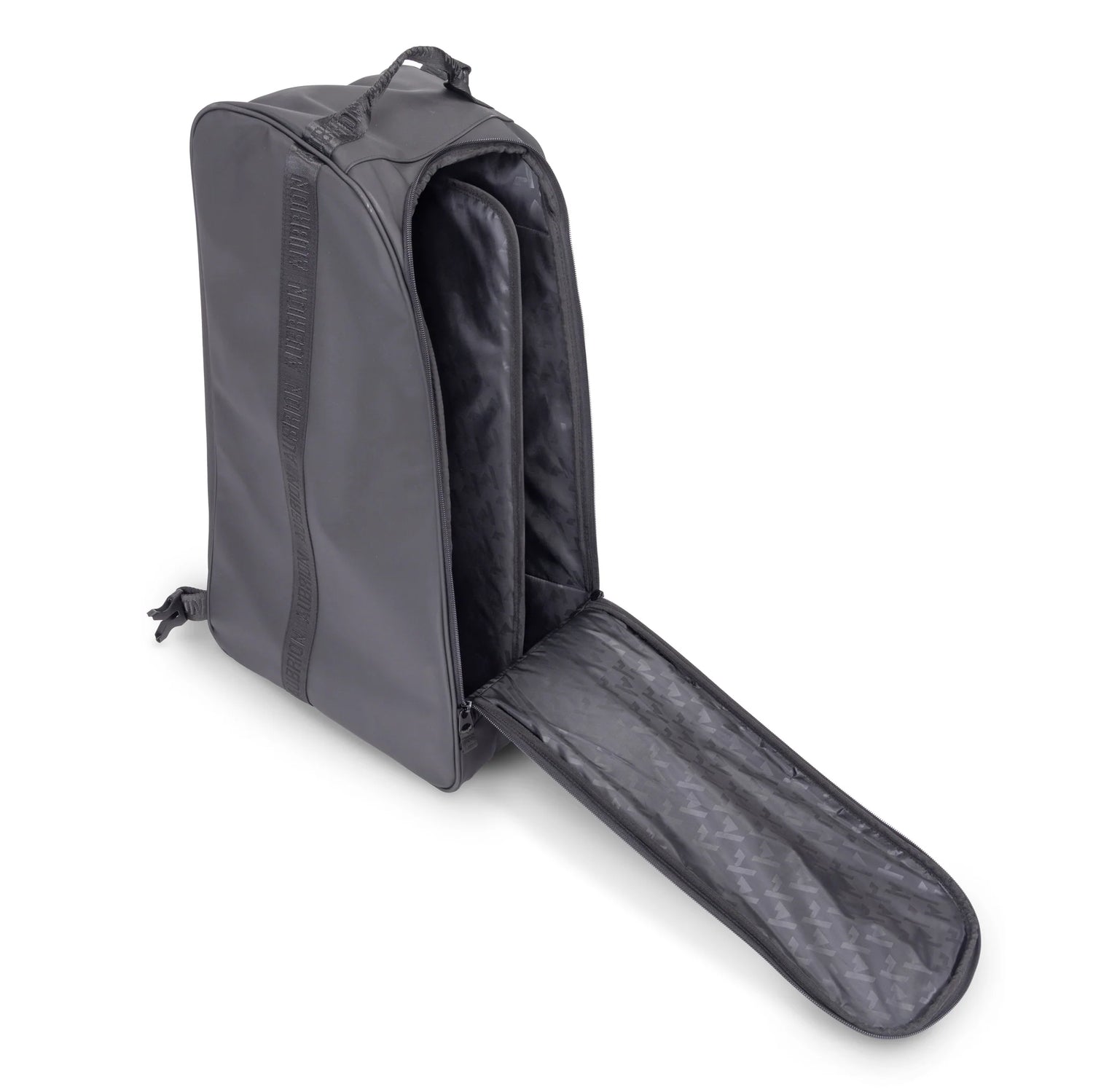 Keep long boots protected in the sleek Aubrion React padded boot bag. A roomy zip opening compartment features an inner divider for individual boot protection. The wipe clean outer has a sporty feel and the bag is styled with an adjustable shoulder strap in smart signature web.