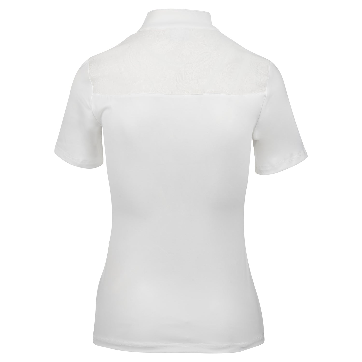 Four-way stretch material ensures exceptional freedom of movement and breathability, keeping riders fresh between classes. Elegant faux pearl buttons and a