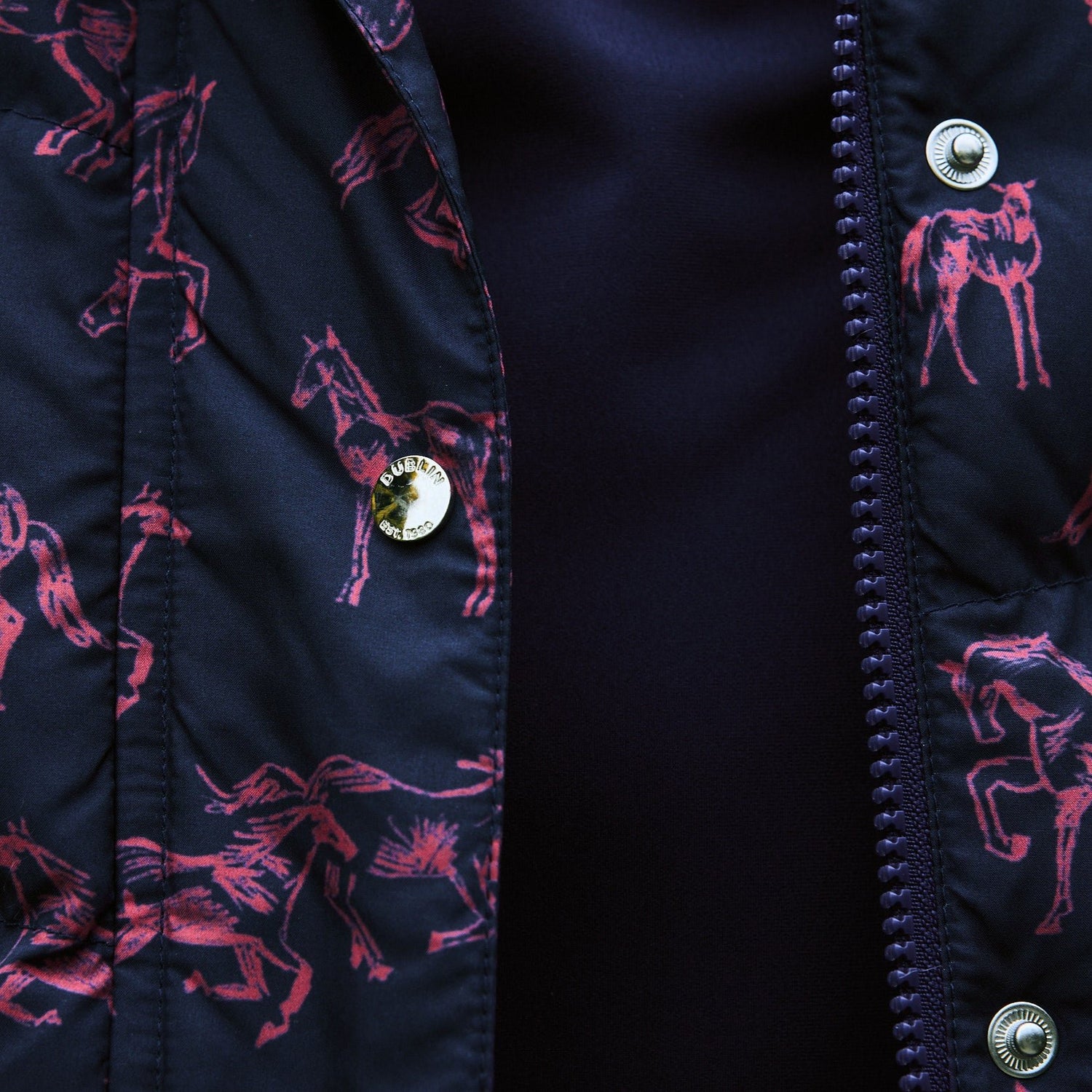 - Double ended front zip and placket finished with metallic press studs.