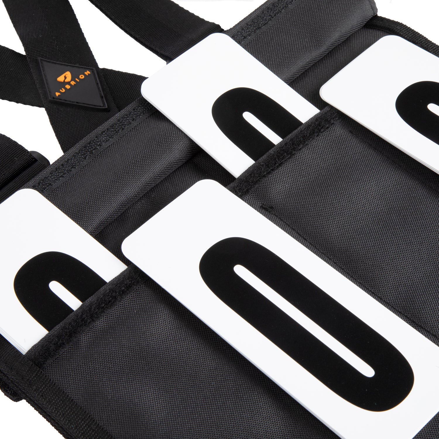 Robust number cards are inserted at the reverse of the display via touch close flaps. Adjustable shoulder straps allow a snug and secure fit. At the waist are elastic straps, one with a slider and a quick-release buckle for easy entry and securing. Aubrion prints to the front and back.