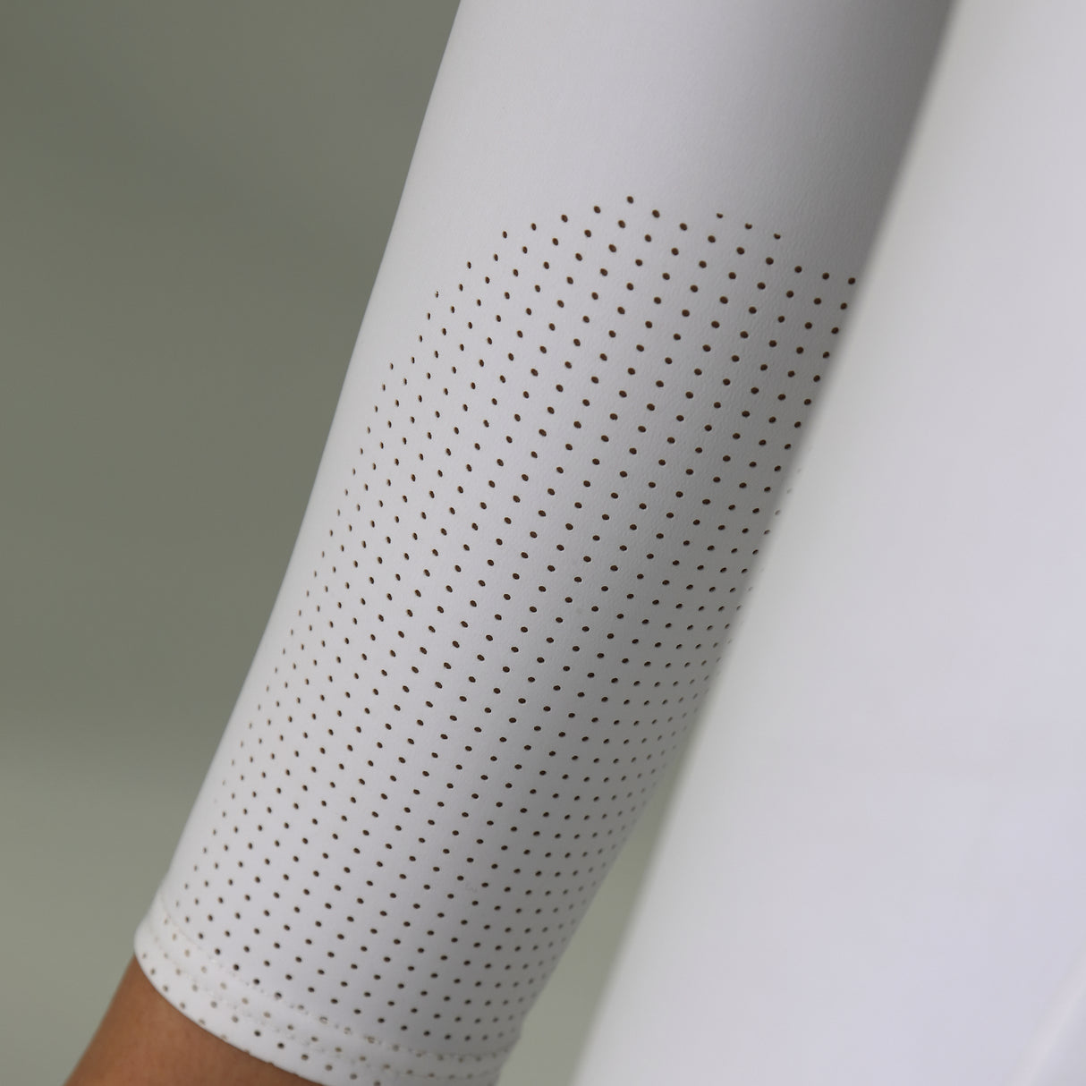 Cleverly engineered, an anatomical cut ensures seams are kept to an absolute minimum for in saddle comfort. Cool fluid fabric assists with excellent moisture management. The ultra-stretch second-skin feel provides revitalising 360º contour support. With a sleek and flexible fit, the high waisted style offers core support for added confidence. The seat has a subtle lattice design silicone print for in-saddle security that catches the light for added lustre. Ankle cuffs are perforated for additional climate control.