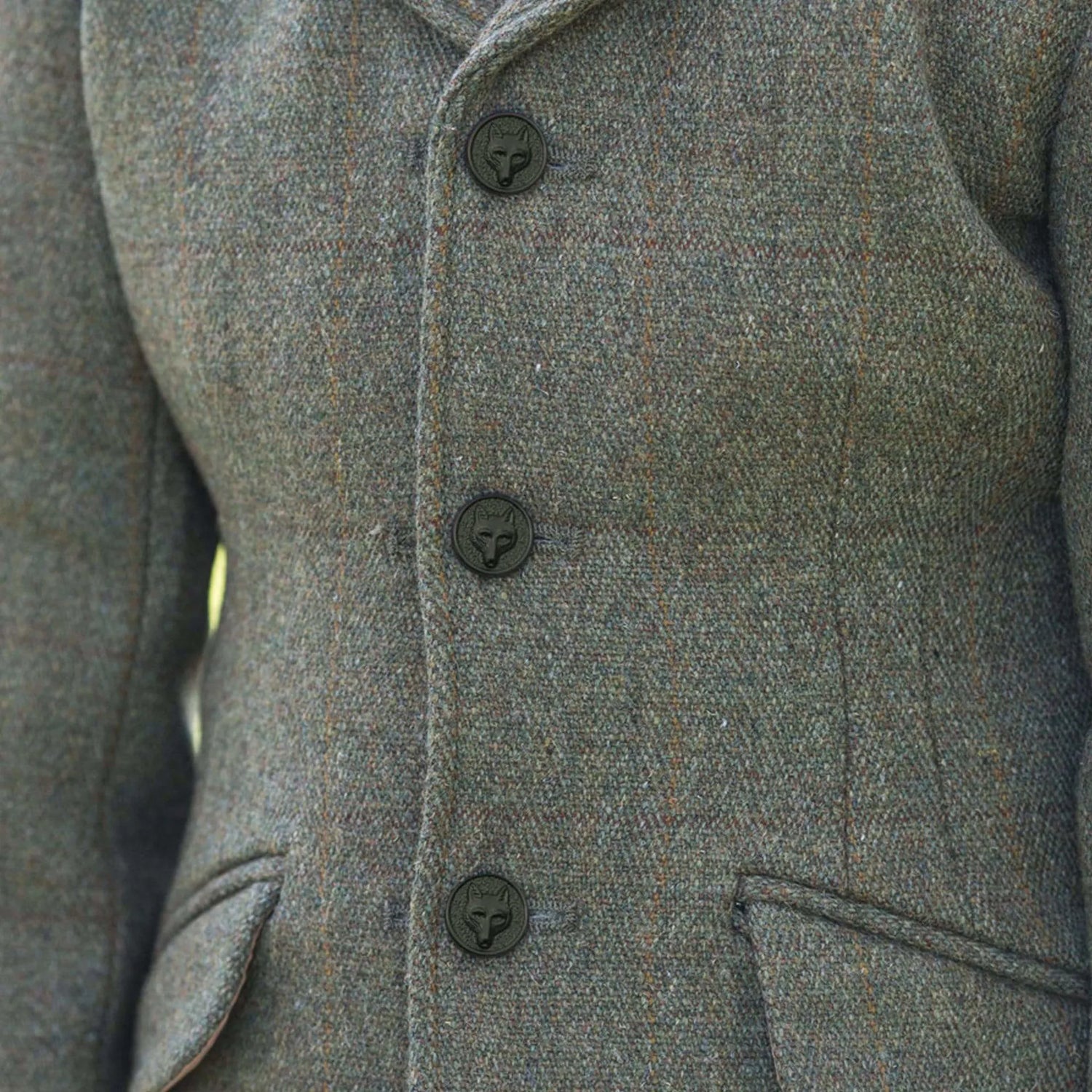 720gram exclusive Equetech Green herringbone tweed with timeless Brown and Canary over check design. Perfect for eventing, cubbing/ hunting and autumn competitions. Features flap pockets with concealed zip pockets, rich gold Equetech jacquard lining and self fabric collar. Poly/Wool. Dry Clean Only.
