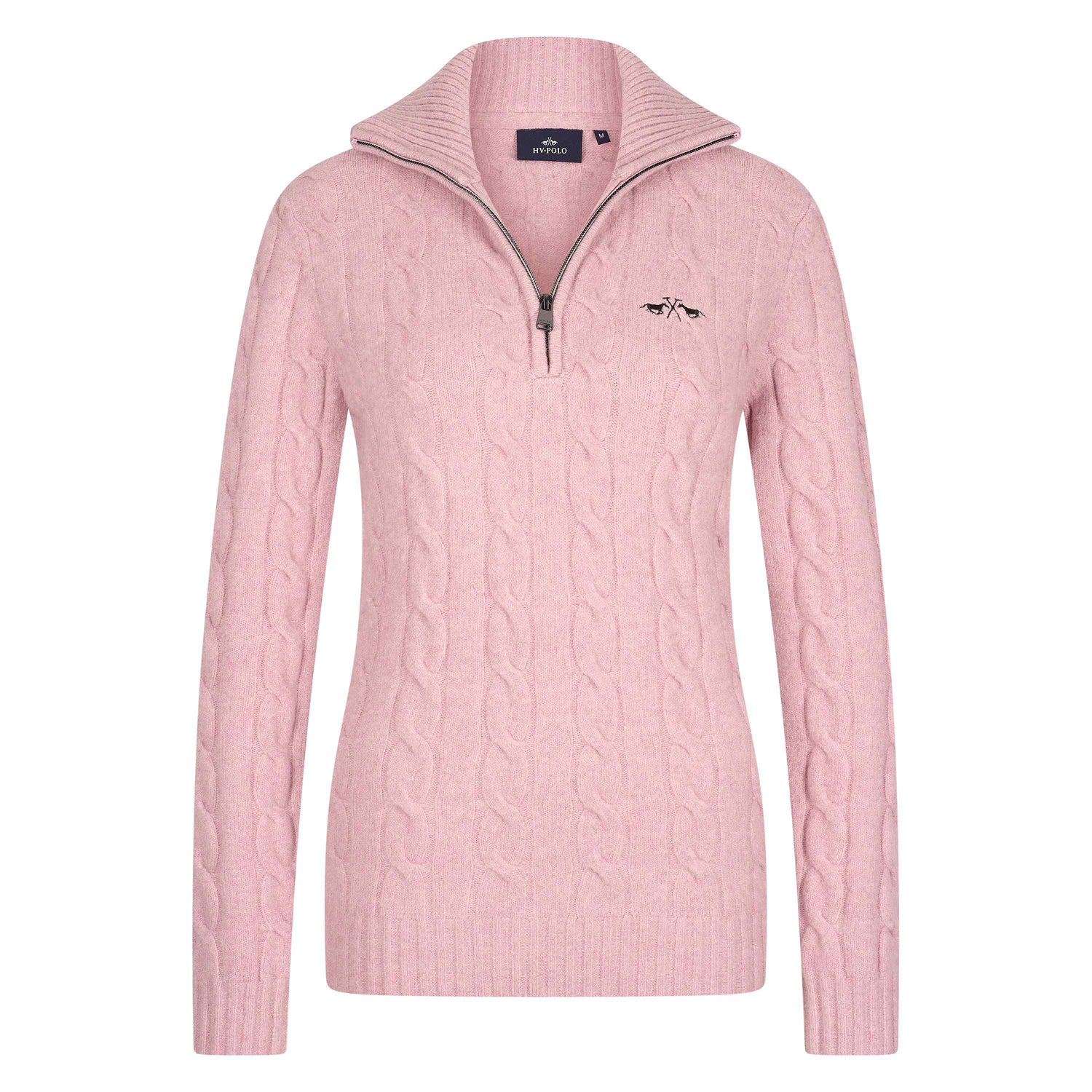 Le pull HV Polo Dunya est un luxueux pull en tricot torsadé doté d'une demi-fermeture éclair, d'un mors métallique à l'ourlet inférieur, de côtes ton sur ton aux poignets et à l'ourlet et d'un col haut avec une fermeture éclair pour une coupe ajustée. Sa poitrine présente un logo Cheval dans une séduisante broderie en lurex, et les emmanchures sont confectionnées dans un style entièrement façonné. Cette pièce unique est composée de 33% coton, 26% acrylique, 23% polyamide, 10% bambou, 5% laine et 3% élasthanne.
