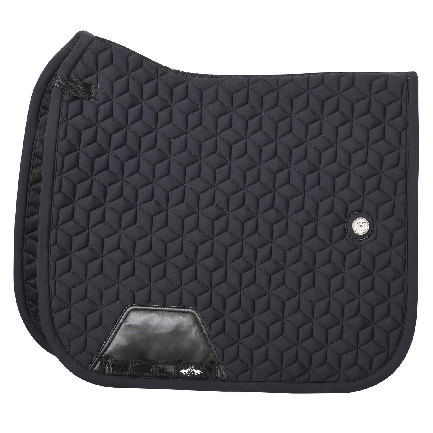 The special lining regulates moisture absorption and sweat release, while the brand logo tape and silicone grip print at the girth strap add a professional touch. The dirt repellent top material and special quilting ensure long-lasting quality. Finished with a round metal logo plate.