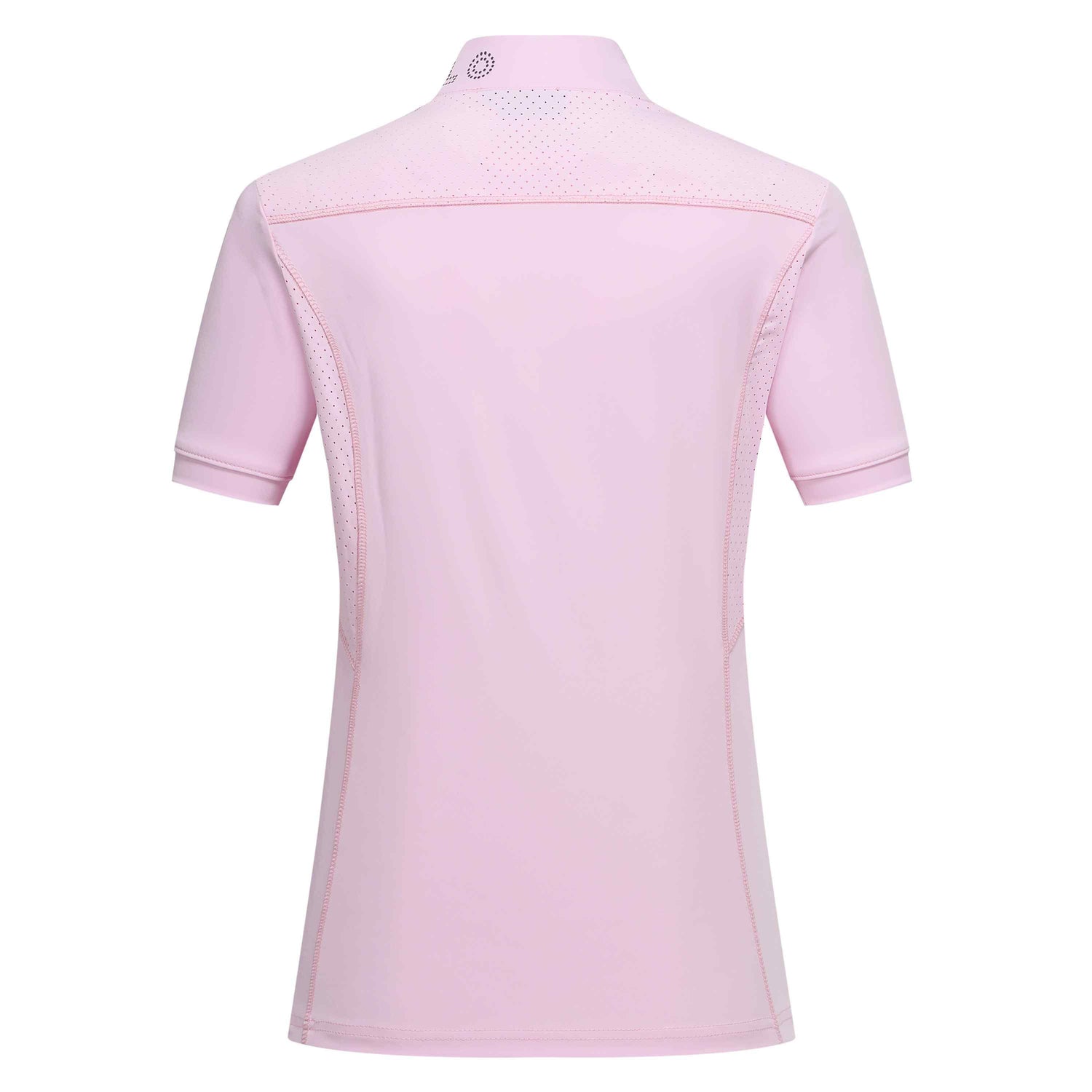 The blind zip closure at the center front adds a sleek element, while short sleeves with fine cuffs enhance overall comfort. The baby lock on seams and a 3D logo heat transfer on the chest contribute to its stylish design. Notably, the HV Polo in rhinestones on the collar and a functional print inside below the neckline add unique finishing touches.