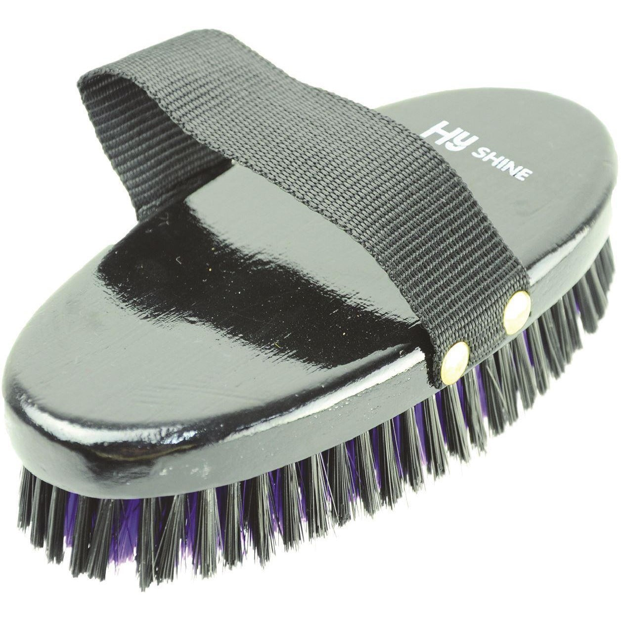 Brosse à corps ovale moyenne laquée noire avec poils en PP souples de style cercle alternatif noir et violet et sangle en PP.