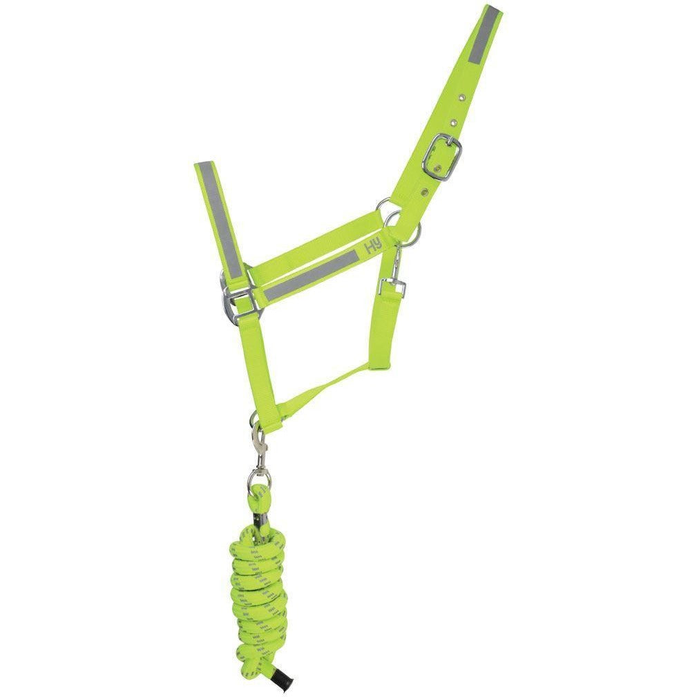 L'ensemble licol et longe parfait pour amener votre cheval du champ pendant les mois d'hiver. Fabriqué à partir d'un tissu jaune fluorescent avec des bandes réfléchissantes argentées supplémentaires autour des montants et de la têtière de la muserolle. Corde de plomb jaune fluorescent assortie à des taches de tissu réfléchissant mélangées.