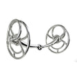 Single-jointed mouthpiece with nut-cracker action, applies pressure to mouth rather than the tongue, stainless steel, multi-point cartwheel to adjust strength of bit.