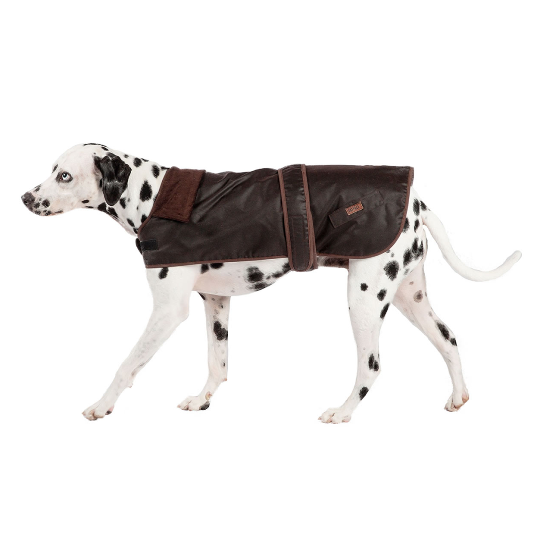 Danish Design Fatface Sussex Dog Coat - This chocolate coloured coat is packed with heaps of great features for furry friends. Made with waxed cotton, for a naturally water-resistant outer and a cosy check burnt orange lining for warmth. The cord-lined collar can sit up or down to offer increased protection depending on the weather and is complete with adjustable Velcro fastenings around the neck and middle. FatFace cotton products support more sustainable cotton farming.