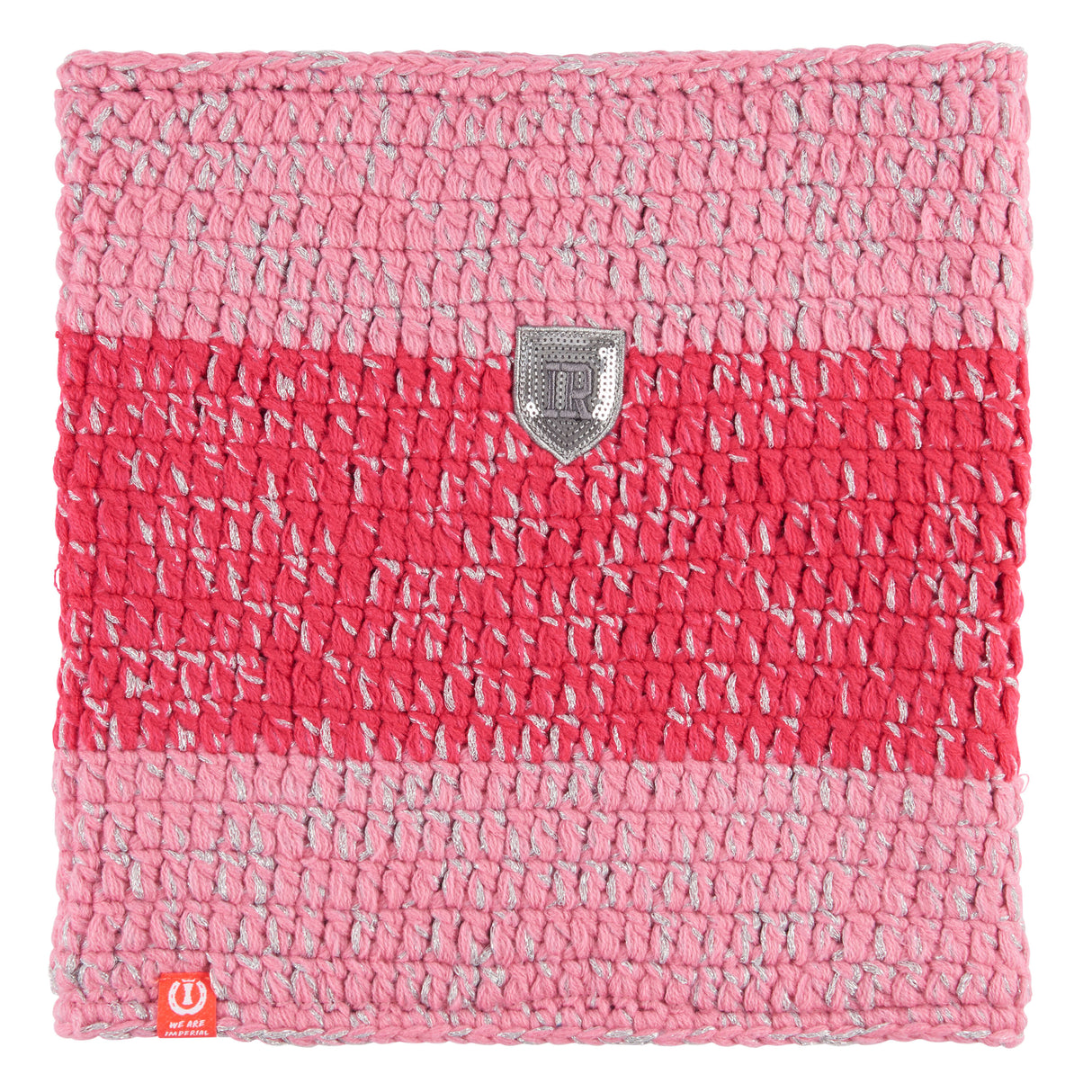 A coarsely knitted scarf with soft teddy fleece lining inside. And for some extra glam we added a badge with sparkling sequins and diva pink contrast coloured label!